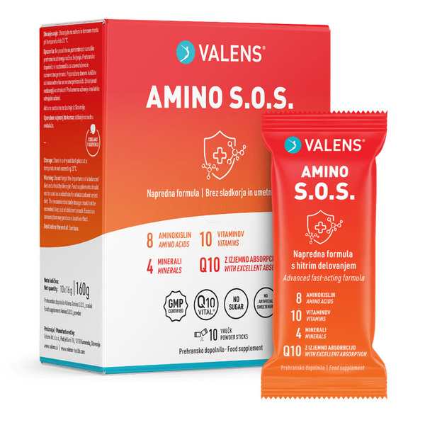 Valens Amino S.O.S., prašek za pripravo napitka je prehransko dopolnilo, namenjeno podpori imunskega sistema in hitrejši regeneraciji telesa.